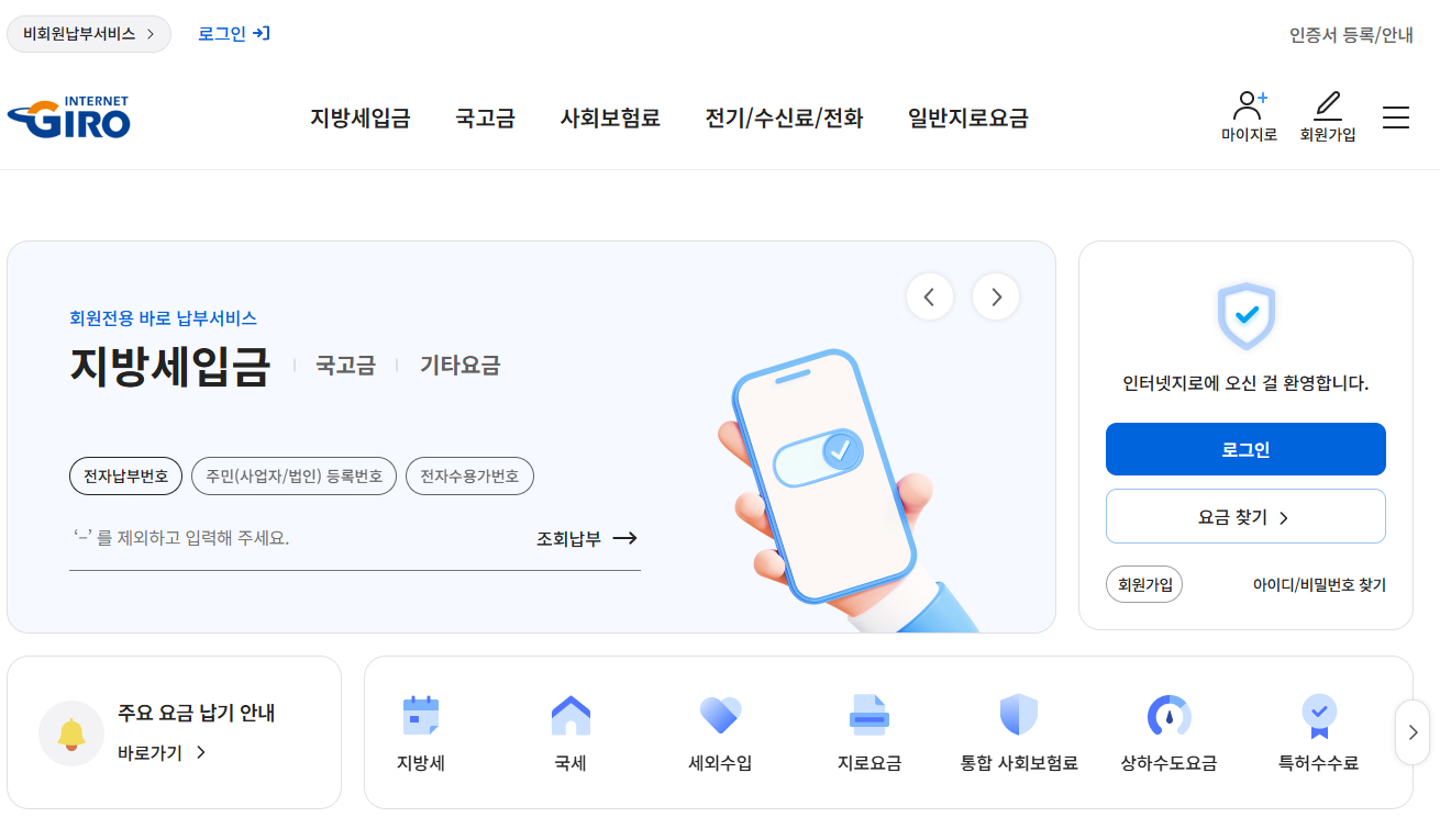 인터넷지로 통합납부서비스를 이용하면 공과금, 세금, 통신요금까지 한번에 납부하고